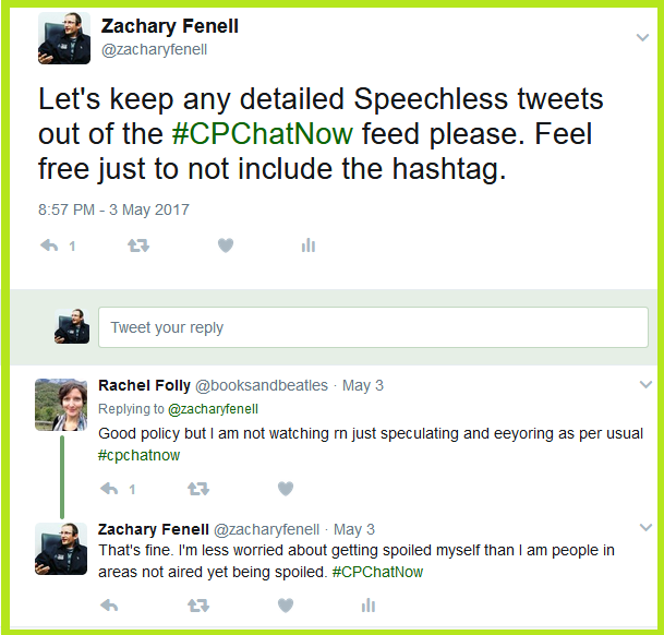 Like I explained on May 3rd, this policy intends to protect participants who live in areas where the show still hasn’t aired. After all, people in different time zones and different countries make up our community! Avoiding spoilers demonstrates thoughtfulness. I personally like to think about #CPChatNow as a thoughtful community.