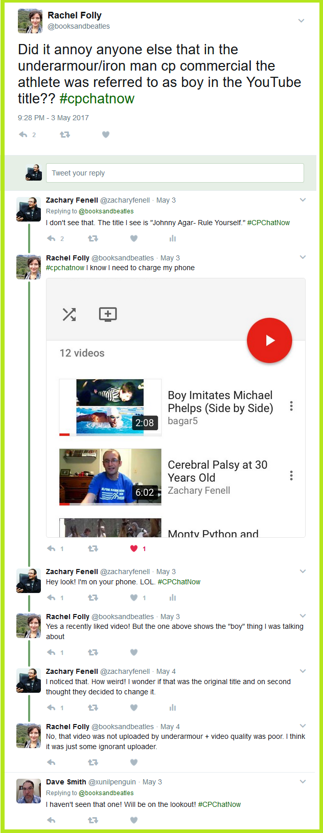 Various topics emerged Wednesday, May 3rd, 2017 amidst the two-hour live cerebral palsy Twitter chat we call #CPChatNow. I am co-host Zachary Fenell and I am here to do but what else?! Recap the previous week’s chat. So get ready to chug along.